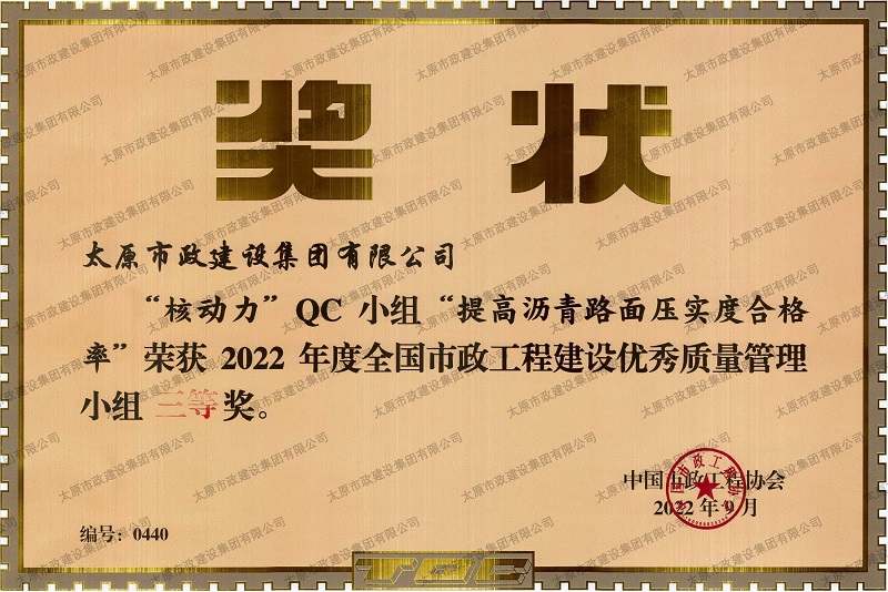 資質(zhì)證書(shū) 營(yíng)業(yè)執(zhí)照 2022年度市政工程最高質(zhì)量水平評(píng)價(jià)_H5-1路道路及配套工程(二標(biāo)段) 2022年度工程建設(shè)誠(chéng)信典型企業(yè) 中國(guó)施工企業(yè)管理協(xié)會(huì)_AAA級(jí)企業(yè)信用等級(jí) 2022年度全國(guó)市政工程建設(shè)優(yōu)秀質(zhì)量管理小組三等獎(jiǎng)_''核動(dòng)力QC小組”提高瀝青路面壓實(shí)度合格率”